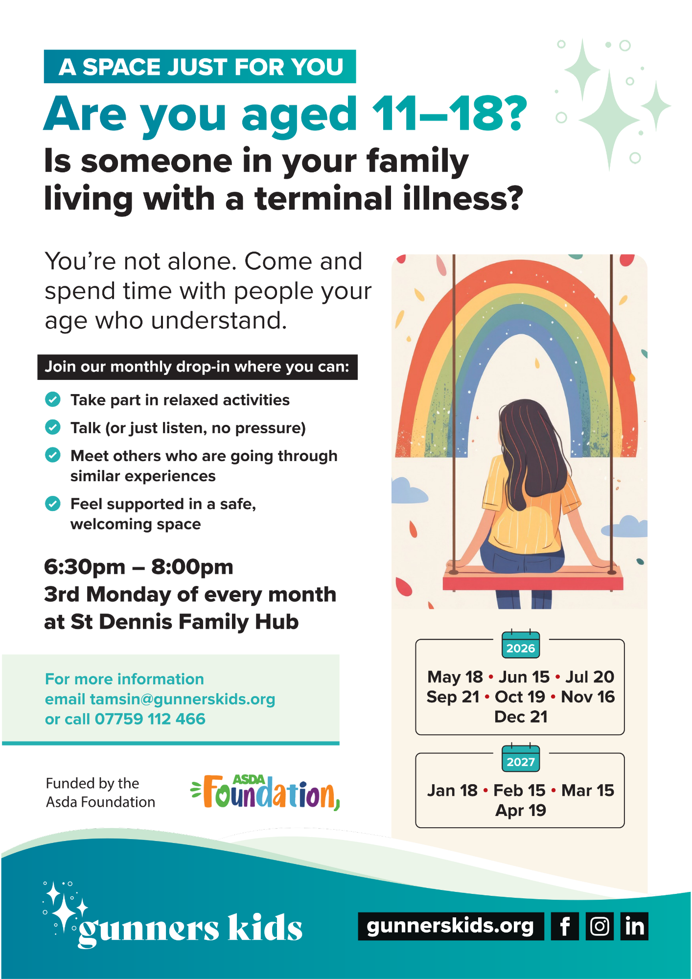 Gunners Kids is an initiative that offers a safe, supportive space for young people aged 11–18 who have a family member living with a terminal illness. Run by Gunners Kids, the monthly drop-in sessions are designed to help students feel less alone by connecting them with others their age who may be experiencing similar challenges. It’s an informal and welcoming environment where there is no pressure to talk—students can simply listen, take part in relaxed activities, and spend time with people who understand.